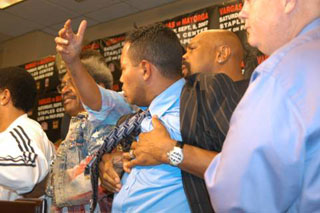 ドン・キング氏の司会のもと、マイクの前に立ったマヨルガは最初、家族のために戦うと神妙に語ったが、徐々にバルガスへの中傷発言へエスカレート。「体重設定の162ポンドはお前がデブだから。これ以上低くては無理」と言い出すと、オカマ、売春婦とののしり出す始末。バルガスも言葉で反発していたが、中傷が妻、子供に及ぶと、ついにキレて2人を含めた両陣営がステージで手を出し合う乱闘に発展。爪でひっかかれた?マヨルガは右ほおを赤く腫らし、別室へ退場した。