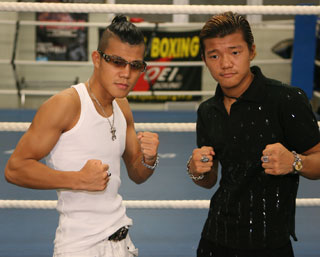 軽くロープを飛んだだけで練習を終了した大毅の相手、ファーペットノーイ・グラティンデーンジム(写真左)は「カメダのことは知っている。僕をKOするって? それはできません」ときっぱり。「(カメダがいうように)僕だって同じ年齢の相手には負けません。経験は僕の方が上です。清水には負けているけれど、清水のほうがスピードがあって強いと思う。カメダの方が戦いやすいでしょう」とあどけなさを残す表情ながらも、気合いのこもったコメントを残している。