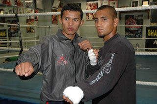興毅の対戦相手となるセサール・ロペス(写真右)は「いい仕事をしたい。カメダのことはこれまで知らなかったが、ビデオを2試合分みて研究した。いい選手だと思うが、私は彼よりキャリアがある。それをリングの上で示したい。KO? 判定でもKOでも勝てばどちらでもいいよ」。ウェイトも113 ポンドで「問題はない。この試合は私にとってもチャンス。踏み台にして上に昇ることを考えている」とロペス。会見後はミット打ちで調整していた。